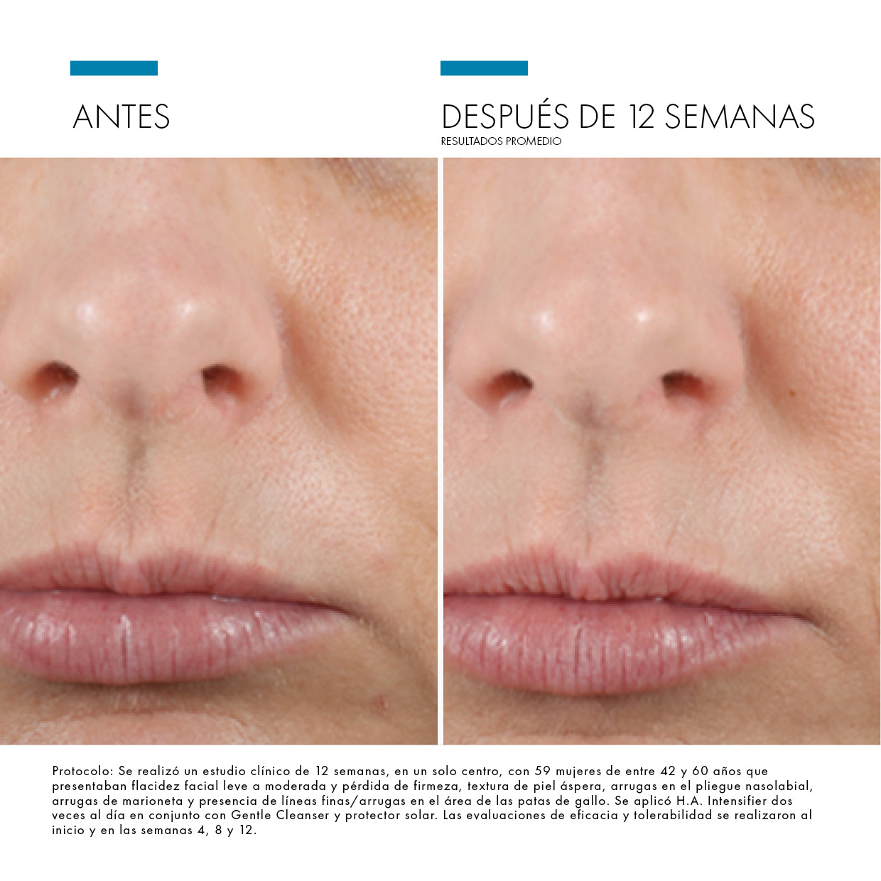 Reduce la apariencia de los surcos nasolabiales, las líneas de marioneta y las patas de gallo para una piel más tersa firme y suave.