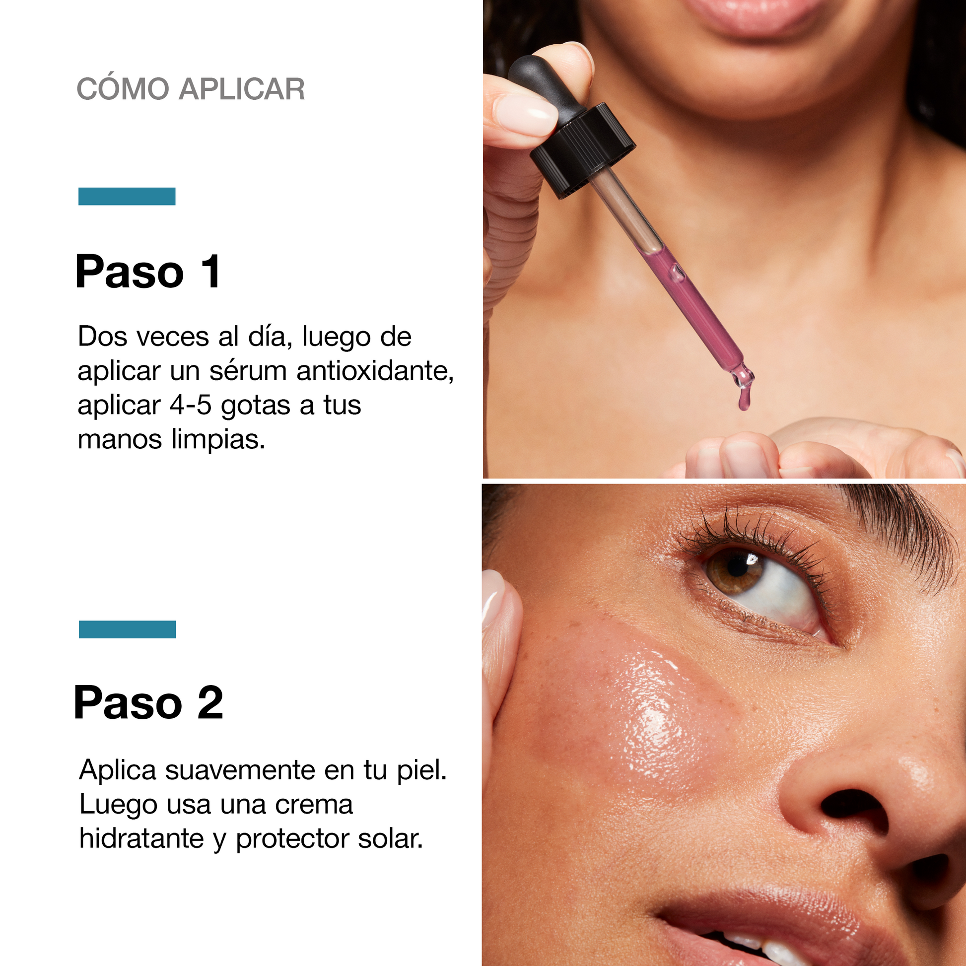 - Aplicar de 4 a 6 gotas dos veces al día sobre el rostro y el cuello. Extender el producto sobre la piel. Si se utiliza por la mañana, aplicar después de un antioxidante SkinCeuticals y antes de un protector solar SkinCeuticals.